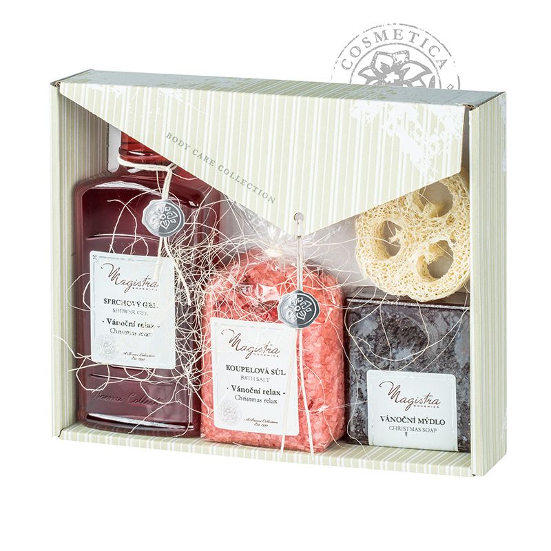 Vánoční balíček obsahuje Vánoční koupelovou sůl s vůní skořice, pomerančů, vanilky a jablek 320g, Vánoční sprchový gel se skořicí, vanilkou a pomerančem 240ml a Vánoční mýdlo 120g.