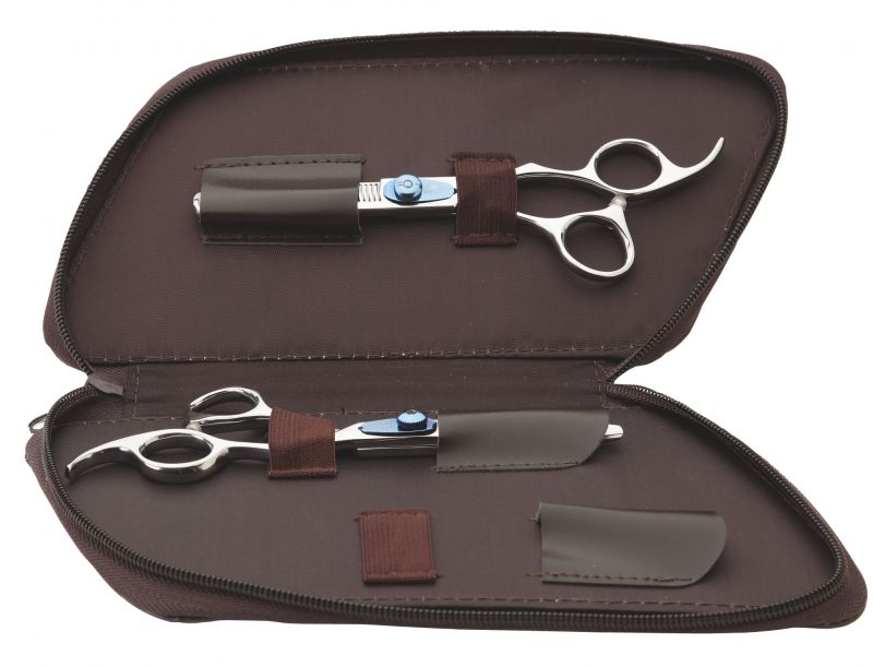 Sada obsahuje profesionální kadeřnické nůžky klasické a efilační, které jsou dodány v koženkovém pouzdře.